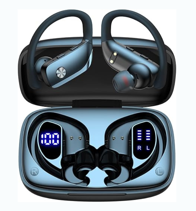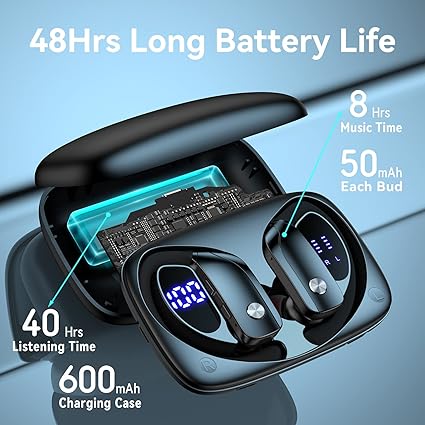 Wireless earbuds with a dual LED display charging case that shows precise battery levels for both the case and each earbud. Bluetooth technology ensures clear, uninterrupted calls and rich stereo sound. Easy one-button control with automatic pairing and a connection range up to 33 ft. Designed for sports, featuring secure fit with flexible earhooks and multiple ear tips for comfort during long workouts or outdoor activities—even in the rain.